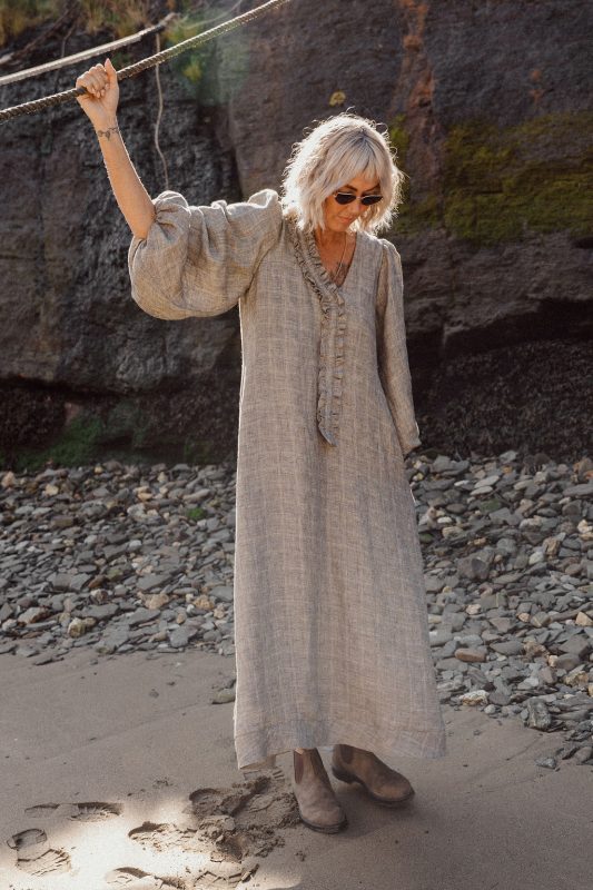 Our Kirtle Dress is a trapeze-shaped silhouette with balloon, billowing sleeves and a beautifully voluminous drape. Fully lined and designed for ease and movement, it combines structure with softness.